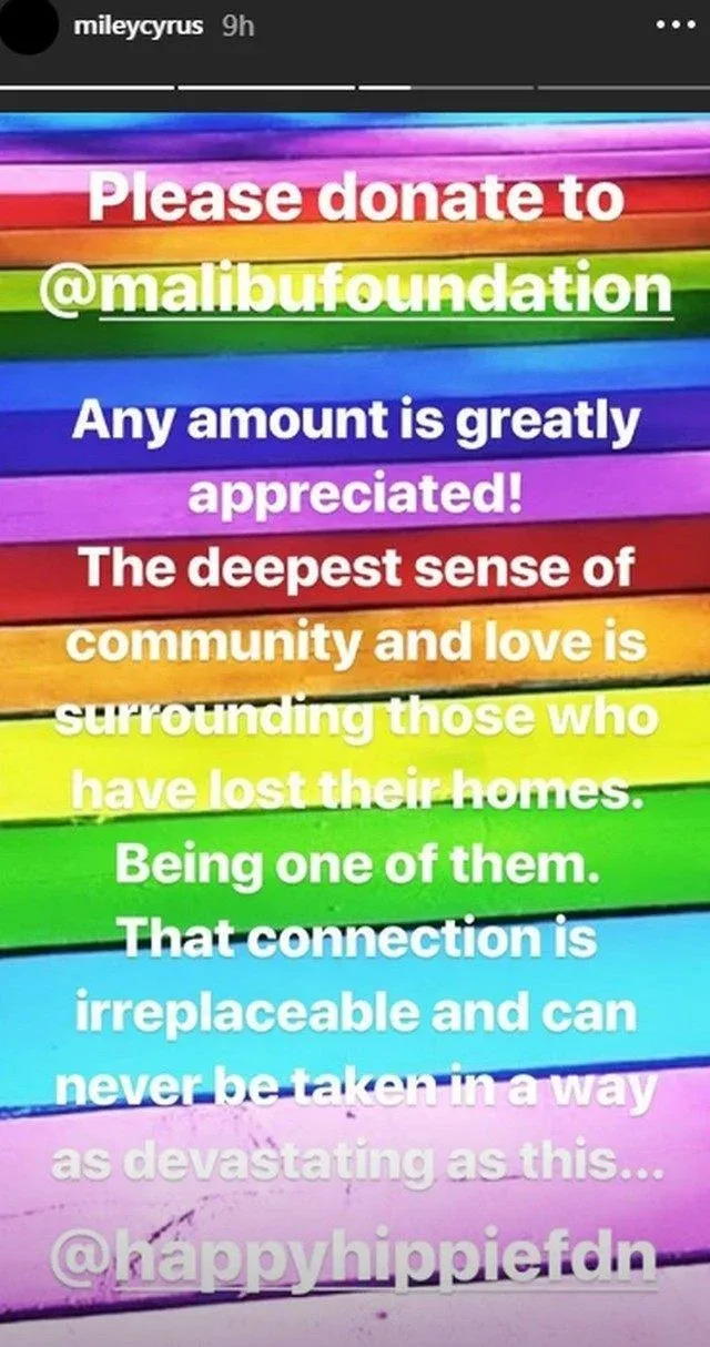 "Estoy completamente devastada por los incendios que afectan a mi comunidad. Soy una de las afortunadas", tuiteó Cyrus. "Mis animales, EL AMOR DE MI VIDA, lograron salir y eso es lo único que importa ahora. Mi casa ya no existe pero los recuerdos compartidos con mi familia y amigos se mantienen. Agradezco todo lo que me queda. Envío todo mi amor y gratitud a los bomberos y al departamento de policía de Los Ángeles". A continuación instó a sus seguidores a donar dinero, tiempo o productos que puedan ayudar a los afectados.