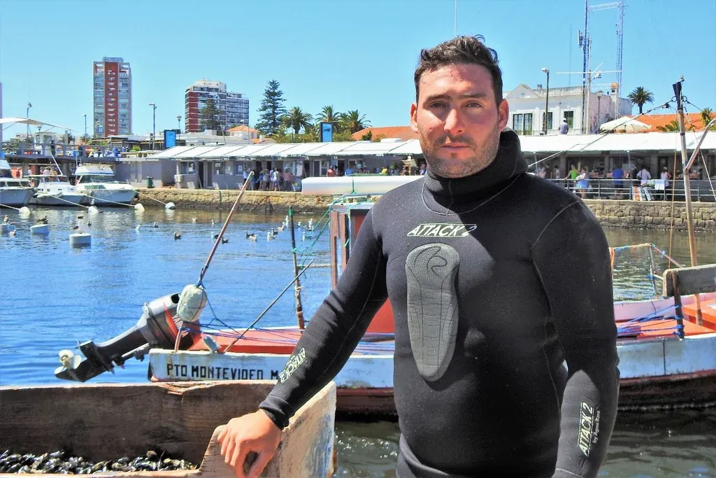 Mariano tiene 29 años y bucea desde hace 12. Aprendió de su tío y de su padre, Jorge, que es el dueño de la pescadería que se ubica en el local 6 del puerto de Punta del Este y que se llama Don Mateo. El buzo cuenta que hoy su padre se tira cada vez menos al agua, y por eso solo quedan otros dos buzos –que también son padre e hijo– y él para pescar todos los mejillones que llegan al puerto.