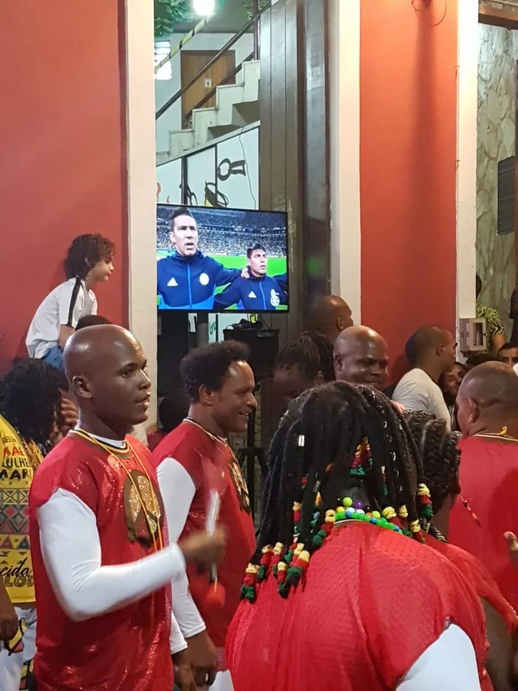 Mientras tanto, los integrantes de Olodum miraban el encuentro con los tambores en el piso y de vez en cuando el director del grupo hacía sonar un redoblante cuando Brasil fallaba alguna jugada.