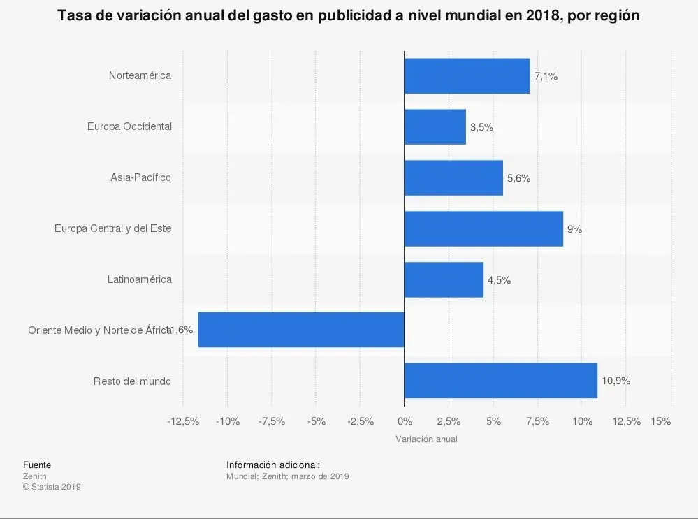 Esta otra gráfica muestra la tasa de variación anual del gasto en publicidad a nivel mundial en 2018, en función de la región. La inversión publicitaria experimentó un incremento en todas las regiones del mundo durante el año referido salvo en el caso de Oriente Medio y el Norte de África, donde dicho gasto disminuyó en algo más de in 11,5% con respecto a 2017.