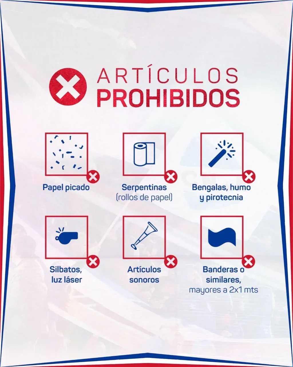 Está prohibido el ingreso de banderas, pancartas y similares de mayor tamaño a 2x1; también la instalación de cualquier elemento en las mallas de seguridad perimetral (tejido).