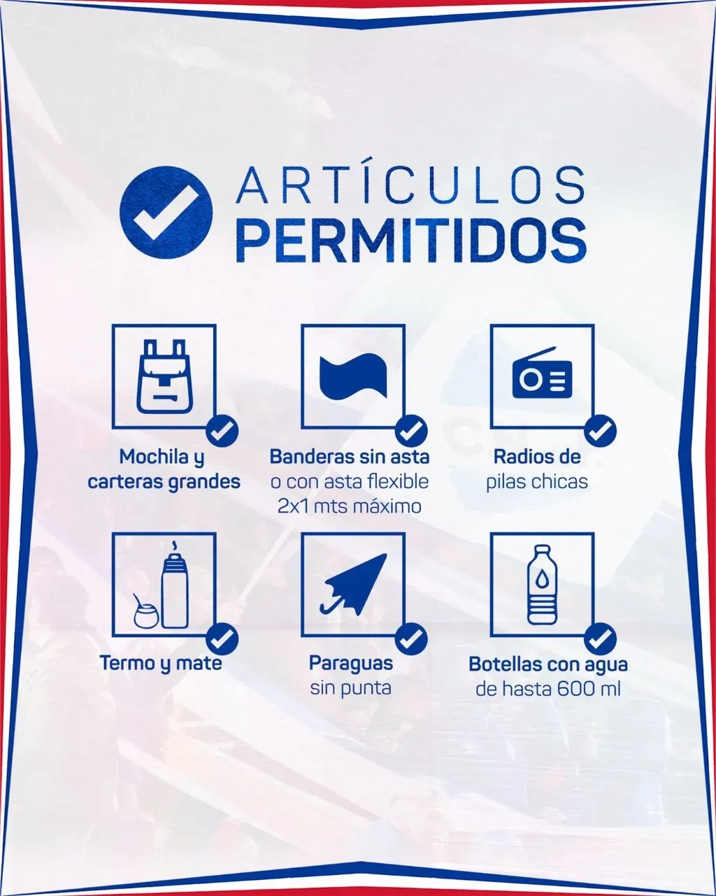 Se puede llevar termo y mate, mochilas y carteras grandes, banderas de hasta 2x1, radio de pilas chicas, botellas plásticas de hasta 600 ml, paraguas sin punta.