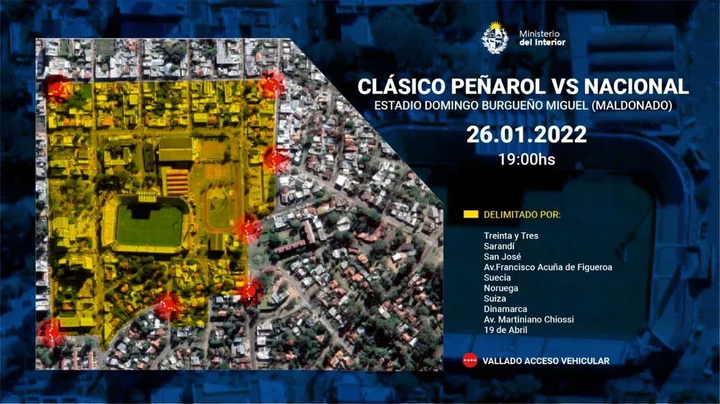A partir de las 15:30 se establecerá la zona de exclusión en torno al estadio que estará delimitada por las calles Treinta y Tres, Sarandí, San José, Francisco Acuña de Figueroa, Suecia, Noruega, Suiza, Dinamarca, Martiniano Chiossi, Democracia y 19 de Abril.