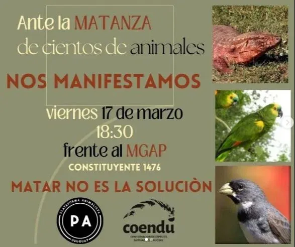 Otras dos ONG, Plataforma Animalista y Coendú, convocaron a una movilización. Se hará este viernes 17, a la hora 18:30, frente a la sede del MGAP, en Constituyente 1476, con la consigna “Matar no es la solución”.