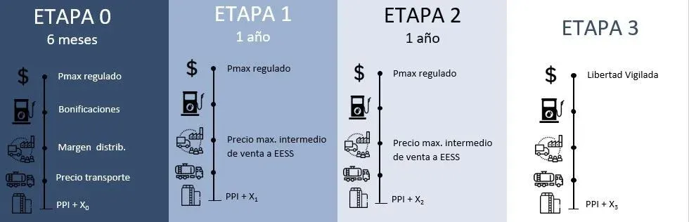 Finalmente, en la etapa tres, el comité de expertos considera que existe un “mercado maduro”, “más competitivo y dinámico” que podría funcionar solo, por lo que la regulación debería ser la mínima que asegure el menor costo de abastecimiento, que haya combustible en todo el país, y que no haya distorsiones en la cadena.