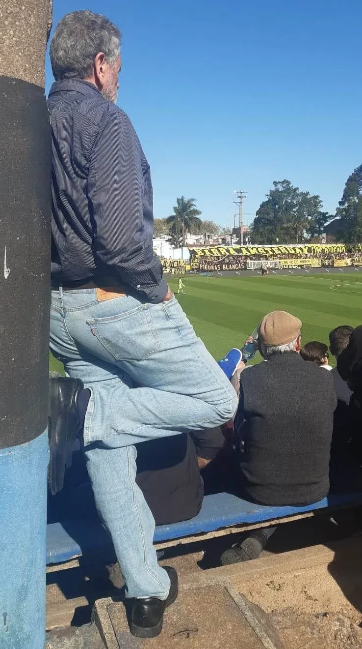 En el segundo tiempo, el frío llegó a Belvedere y se puso una campera, y se ubicó parado nuevamente, sobre una columna, pero del otro sector, ya que Liverpool atacaba hacia el arco opuesto.