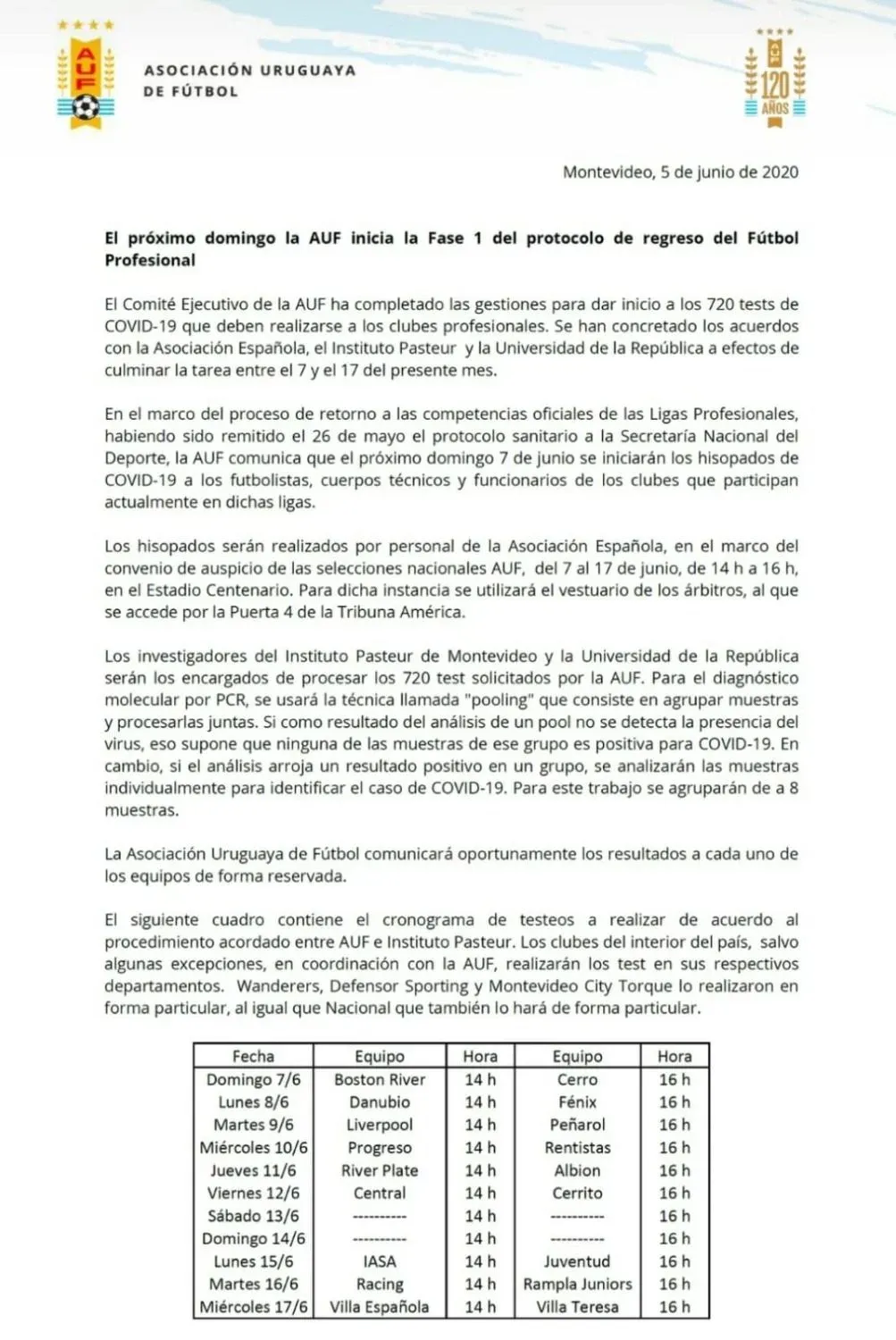 Según el comunicado se llevarán a cabo un total de 720 hisopados en 10 días, desde el 7 al 17 de junio y allí están incluidos todos los clubes excepto Defensor Sporting, Wanderers y Montevideo City Torque que ya se lo hicieron por su cuenta como informó Referí, en tanto que tampoco fue tomado en cuenta Nacional, ya que tenía programado con antelación hacérselo a sus jugadores el próximo jueves 11 en su sede.