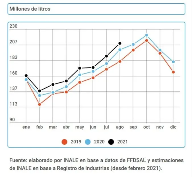 Lo remitido durante el octavo mes de 2021 es el máximo para un agosto desde lo que sucedió en 2020, cuando se había logrado el récord previo, ahora superado por 9.617 litros.