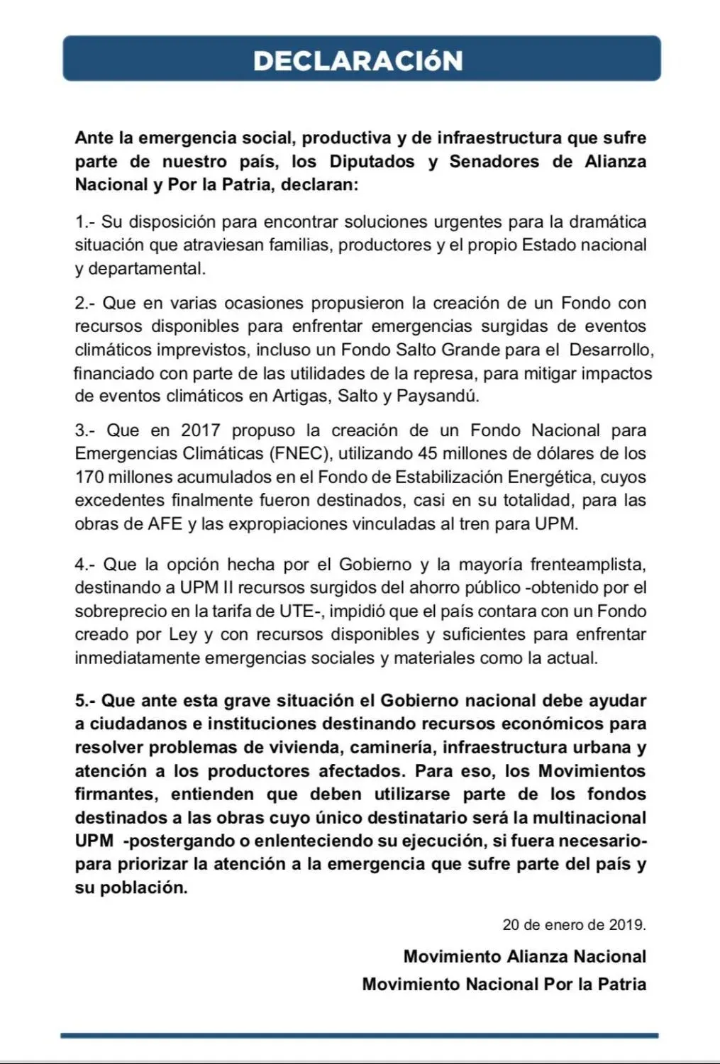 Además en la declaración se afirma que en el año 2017 una de las propuestas fue la creación de un Fondo Nacional para Emergencias Climáticas "utilizando US$ 45 millones de los 170 millones acumulados en el Fondo de Estabilización Energética". Los excedentes de este fondo, según los nacionalistas, fue destinado en su mayoría para las obras de AFE y las expropiaciones vinculadas al para UPM.