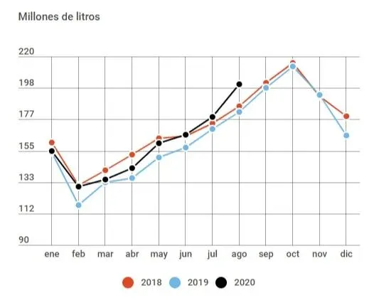 Durante agosto de 2020, por mencionar uno de los casos, se remitieron a las plantas industriales 201 millones de litros de leche, es decir un 10,8% más que la remisión que hubo en agosto del año pasado.