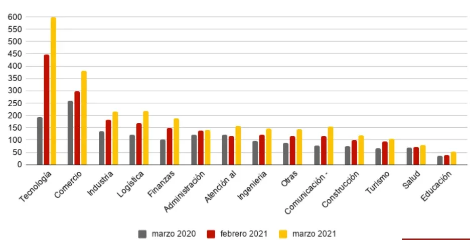 Todas las actividades aumentaron la cantidad de propuestas en comparación al mes anterior. El sector tecnológico fue el que más aportó al incremento mensual, con 152 llamados más que el mes anterior. En segundo lugar, está comercio que sumó 85 oportunidades más (un crecimiento del 29%) y, en tercer lugar, logística, que incrementó un 28%, lo que se en 47 llamados más que en febrero 2021.
