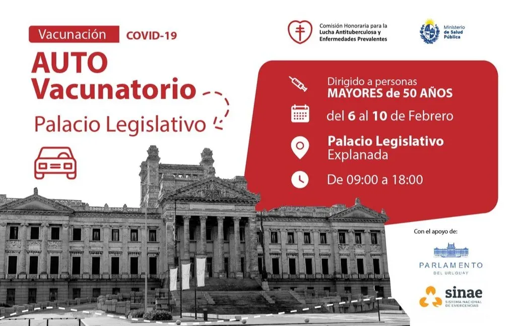 Desde el próximo lunes 6 al viernes 10 de febrero se instalará un auto-vacunatorio en la explanada del Palacio Legislativo. Se suministrarán dosis de refuerzo a personas mayores de 50 años.