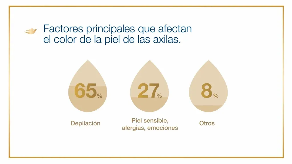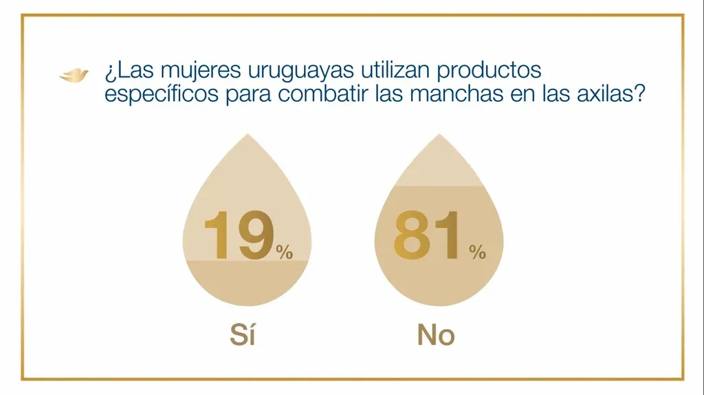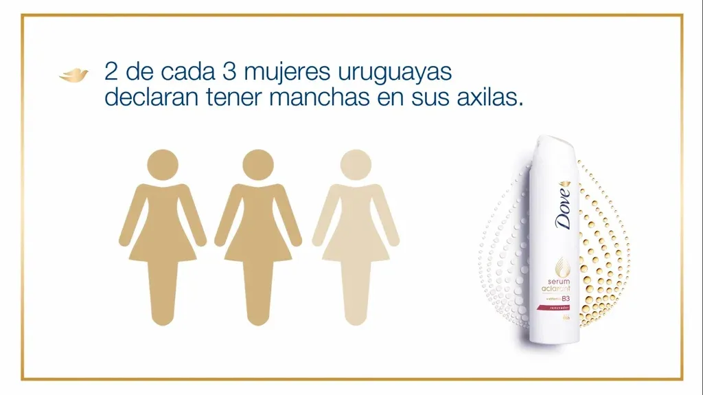 Según una investigación global de la marca, una de cada tres mujeres en todo el mundo sufren de un tono de piel desigual, re ejado principalmente en manchas oscuras o hiperpigmentación en el área de las axilas. A nivel local, Dove realizó una consulta a más de 4.300 mujeres en la que se concluyó que dos de cada tres uruguayas admite tener oscurecida la piel de sus axilas.