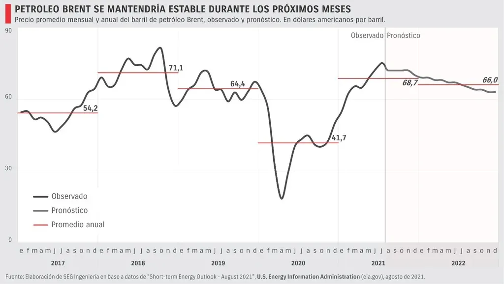 El barril Brent se estabilizaría en torno a los US$ 70 en lo que resta de 2021, luego de tres meses al alza, escribió en Twitter la consultora SEG Ingeniería, que citó la proyección de agosto de la Agencia Internacional de Energía con una cotización promedio de US$ 68,7 para 2021.