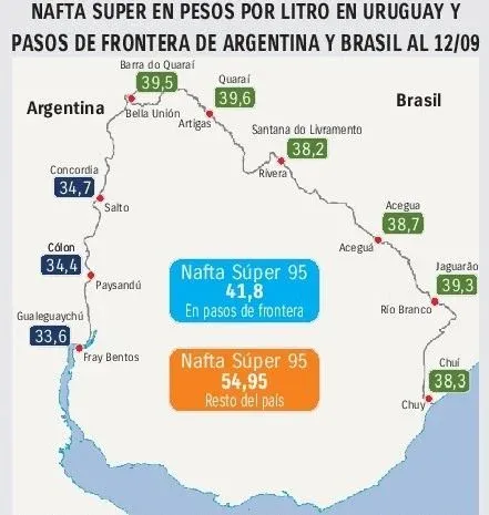 SEG informó que en el caso de las ciudades fronterizas de Brasil la nafta uruguaya es un 7% más cara en promedio, siendo en Santana do Livramento donde se consigue el combustible más barato con un precio de $ 38,20 el litro, mientas que en Quaraí, en la frontera con Artigas, es donde se paga más cara a $ 39,60 el litro.
