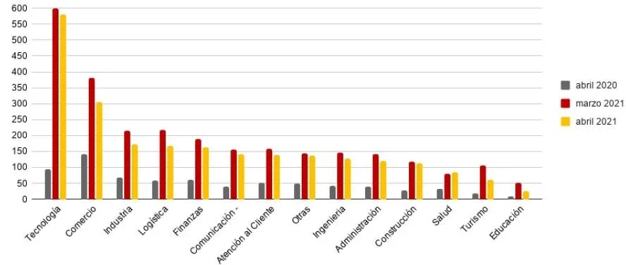 Con respecto a marzo, se registró una caída de 14 % en las oportunidades laborales, luego de tres meses consecutivos de crecimiento. La principal hipótesis de este cambio en la tendencia es el agravamiento de la situación sanitaria en el país. Se enfermaron 90 mil personas y se acumularon la mitad de todas las muertes relacionadas al virus solo en abril, lo que pudo haber llevado a que las empresas se movieran con mayor cautela en el mercado laboral.
