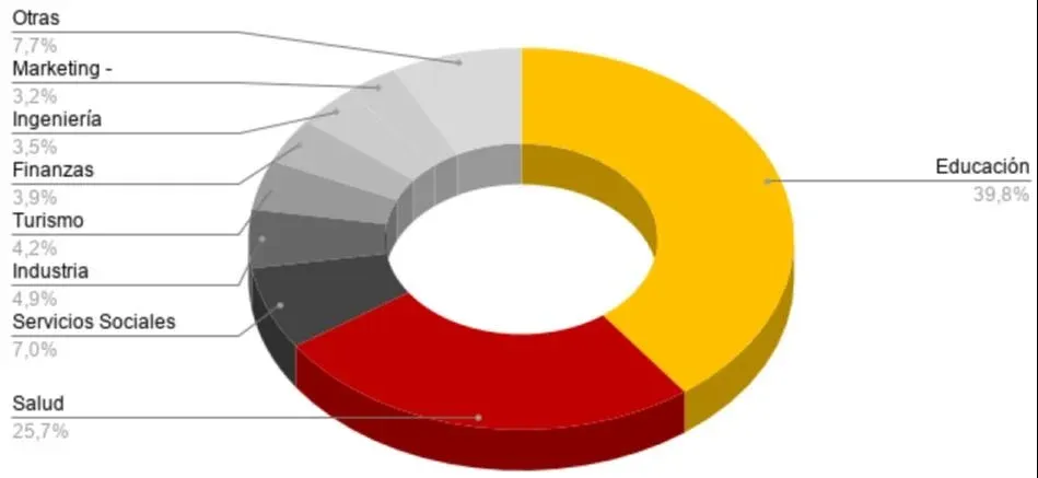 Analizando por actividad, el principal destino de los llamados del Estado es para educación, con un 40% del total, aumentado 30% con respecto al mes anterior. Le sigue salud con 26% y una caída mensual de 23% y en tercer lugar se encuentra servicios sociales, acumulando 7% del total de llamados del sector público en abril 2021.