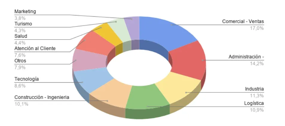 El sector que más oportunidades laborales tuvo fue el de comercio y ventas, con 232 propuestas, el 17% de la demanda total del mes. Con 194 ofertas, le sigue administración y finanzas; y en tercer lugar está la industria, con 154 propuestas.