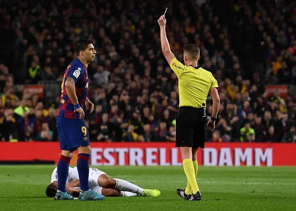 Luis Suárez vio amarilla a los 39' por una infracción en la mitad de la cancha.