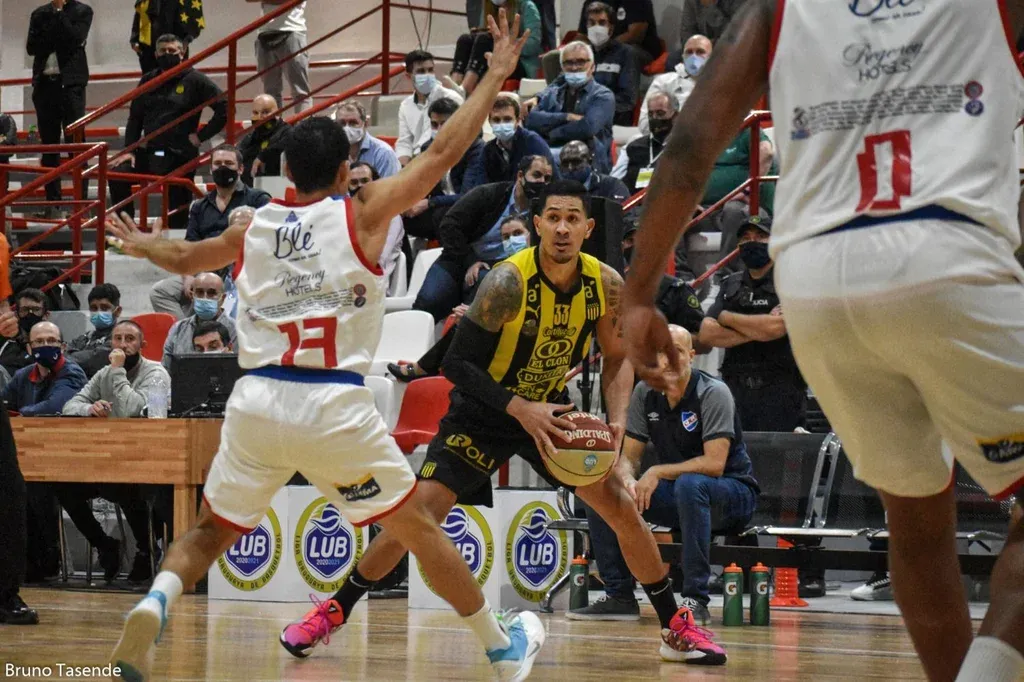 Devon Collier, que tuvo un gran debut, ataca al Tito Borsellino Bruno Tasende, basketuruguay.uy