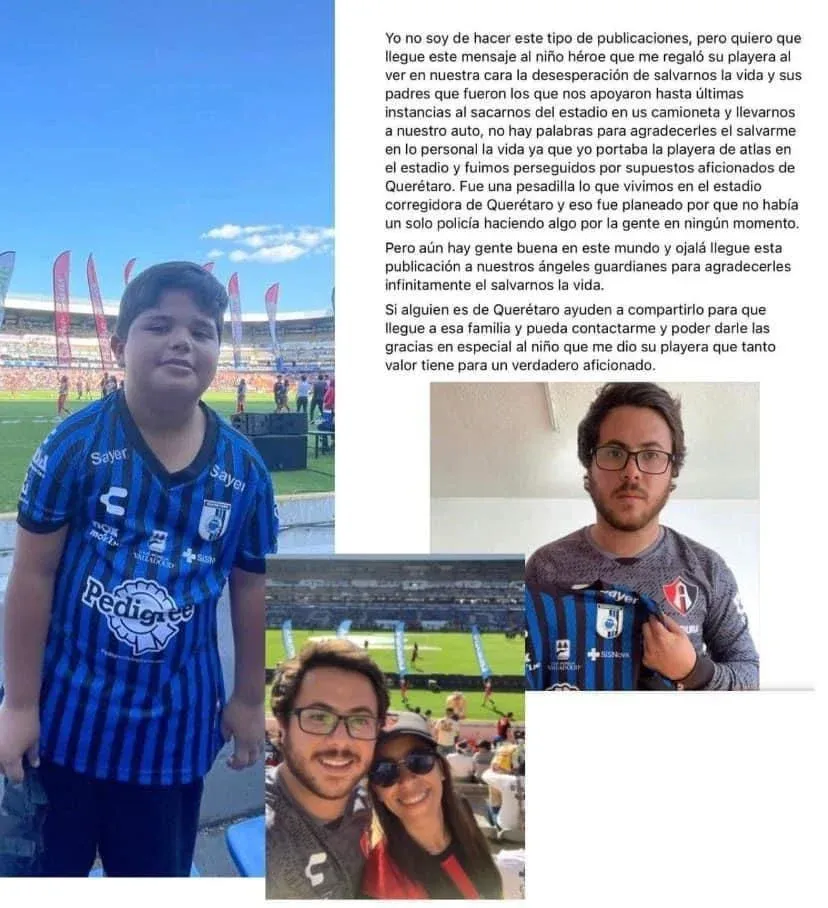 "Quiero que llegue este mensaje al niño que me regaló su playera al ver en nuestra cara la desesperación de salvarnos la vida y sus padres que fueron los que nos apoyaron hasta últimas instancias al sacarnos del estadio en su camioneta y llevarnos a nuestro auto", escribió el aficionado de Atlas en sus redes sociales.