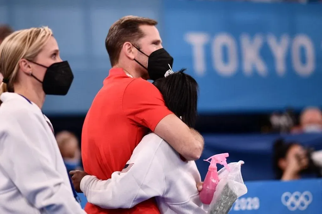 Biles y su entrenador tras dejar la prueba este martes