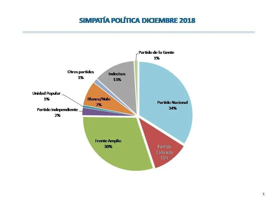 En concreto, en diciembre la intención de voto de los partidos fue de 34% para el PN, 30% para el FA, 11% para el PC, 2% para el PI, 1% para Unidad Popular (UP), 1% para el Partido de la Gente y otro 1% repartido entre otros partidos.