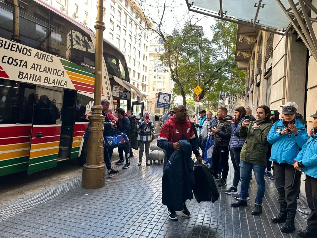 Pasado el mediodía, llegó al hotel de avenida Roque Sáenz Peña para esperar el arribo de los futbolistas albos. De campera, abrigado, por debajo se le veía una camiseta tricolor de la década de 1990, con una marca de pinturas como patrocinador.
