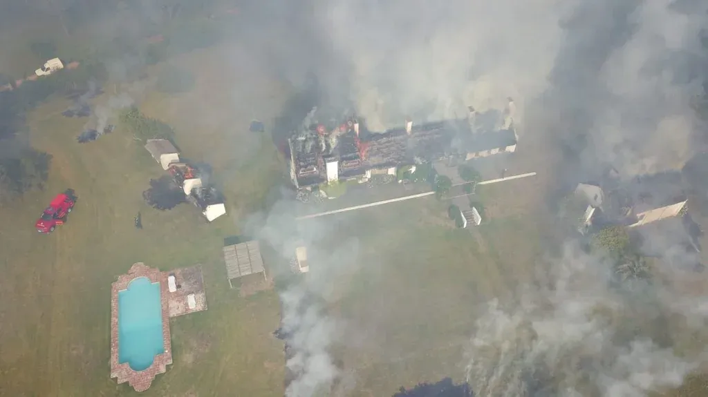 Funcionarios de Bomberos del departamento de Maldonado trabajan en la tarde de este miércoles para controlar un incendio en dos casas en Punta del Este, en la zona de Laguna del Diario. La dotación de los socorristas busca evitar que el fuego se extienda a las casas linderas.