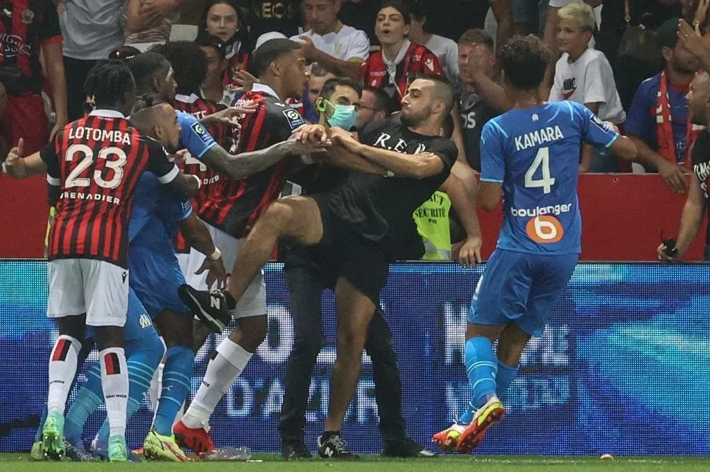 AFP Los incidentes en Niza - Marsella Un cordón de seguridad trató de frenar a los aficionados, pero la situación se hizo caótica, con intercambios de golpes en diferentes sectores del terreno de juego, entre aficionados, jugadores de los dos equipos y miembros de seguridad.