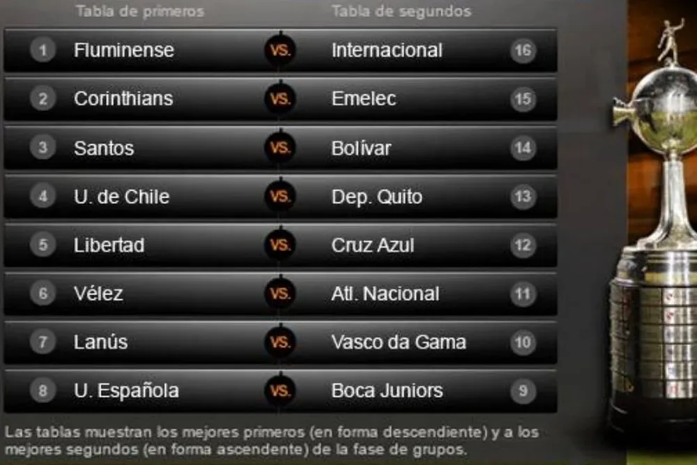 Otros que están en octavos son Cruz Azul mexicano, que goleó por 4-1 a Nacional paraguayo para quedar segundo del grupo 6, con once puntos detrás de Corinthians; y Libertad paraguayo, el único 'guaraní' en carrera al liderar con trece unidades el grupo 5 por delante de Vasco da Gama.