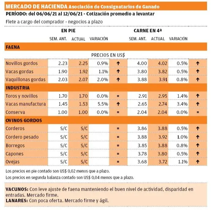 La firmeza también predomina para los lanares, con el cordero cercano a los US$ 4 por kilo y en negocios puntuales superando esa referencia. El borrego especial cotiza entorno a US$ 3,90, el capón US$ 3,80 y la oveja US$ 3,70. Hay mucho interés de compra, prácticamente sin oferta.