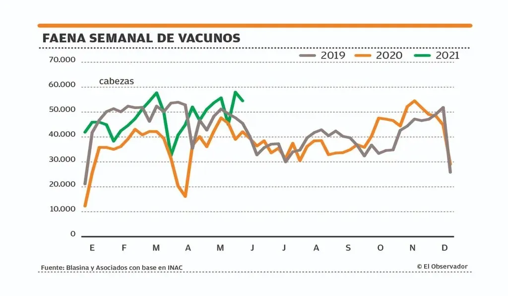 Esta firmeza en el mercado internacional impulsa la faena, que la semana pasada bajó moderadamente, pero se mantuvo por encima de las 50.000 reses por segunda semana consecutiva. Al 12 de junio se faenaron 54.494 vacunos, una baja de 6% frente a los 57.982 procesados la semana previa pero un incremento de 38% respecto a igual semana del año pasado, de acuerdo a los datos del INAC.