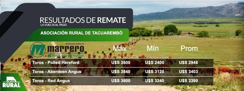 El promedio general de la venta fue US$ 3.225. Los toros Aberdeen Angus un valor promedio de US$ 3.403 (US$ 3.390 los Red Angus), mientras que los Polled Hereford promediaron US$ 2.948.