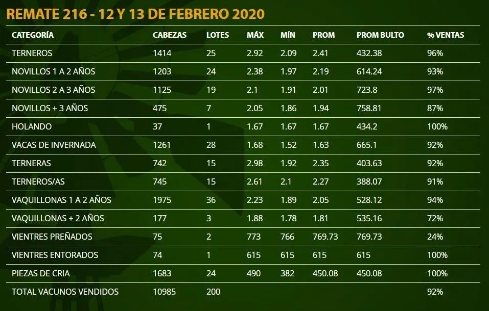 El director de Ramos & García hizo referencia a que los terneros hicieron un promedio de US$ 2,41 por kilo y los novillos de uno a dos años lograron US$ 2,19 y que esas fueron las categorías que mantuvieron el precio de diciembre de 2019.