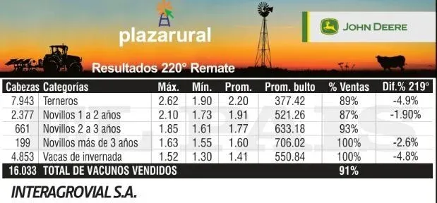 Álvaro García, presidente de Plaza Rural, recordó que durante la primera jornada se colocó el 88% de los terneros, con un ajuste a la baja de 4,9%, promediando US$ 2,20 por kilo.El rematador opinó que fue una buena venta, teniendo en cuenta la cantidad de cabezas que se ha dispersado en los últimos dos meses, en donde solo Plaza Rural ofreció 16.500 terneros.