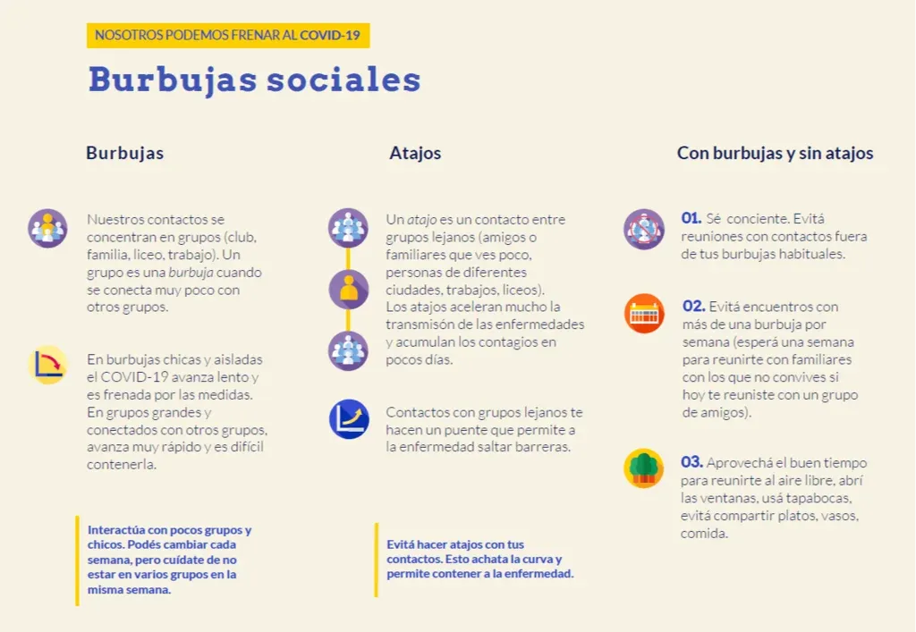 “Interactuá con pocos grupos y chicos. Podés cambiar cada semana, pero cuidate de no estar en varios grupos en la misma semana. Evitá encuentros con más de una burbuja por semana (esperá una semana para reunirte con familiares con los que no convives si hoy te reuniste con un grupo de amigos)”, sugieren.