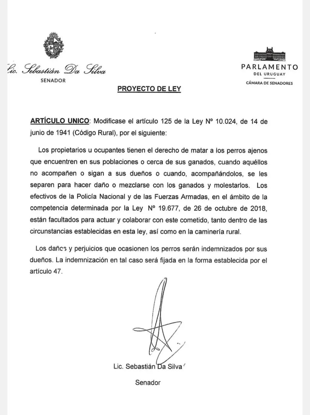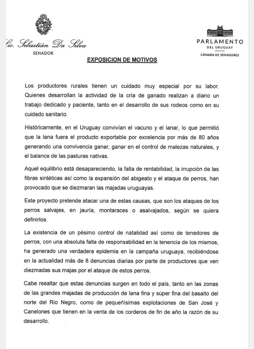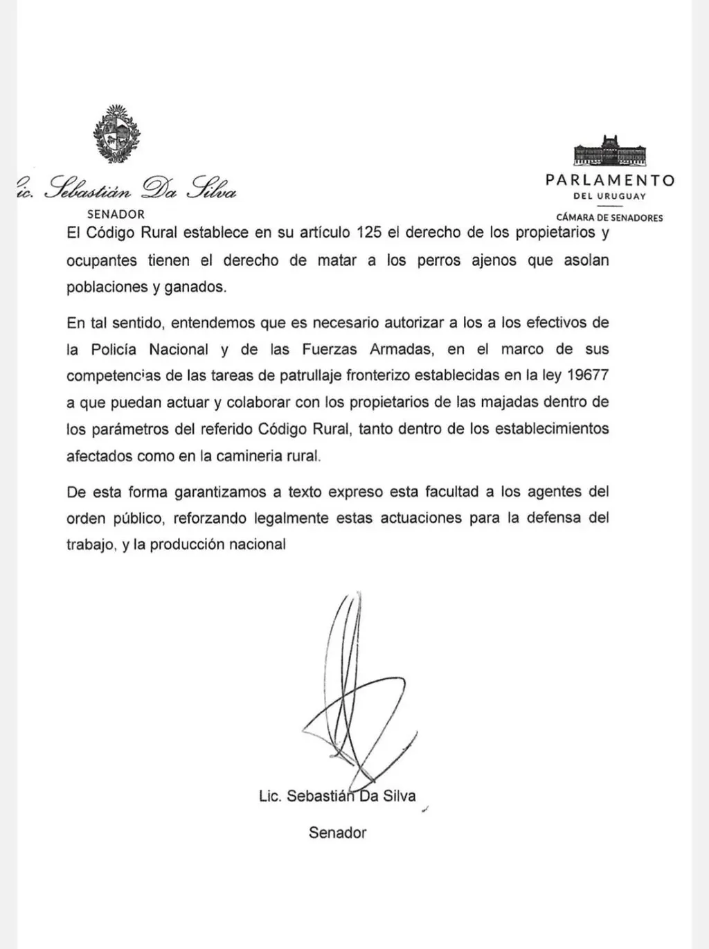 Efectivos de la Policía y militares integrantes de patrullas fronterizas podrán colaborar en el combate que los productores hagan a jaurías que se compruebe estén realizando ataques a sus animales, en caso que prospere un proyecto de ley que para modificar el Código Rural presentará este martes el senador nacionalista Sebastián Da Silva.