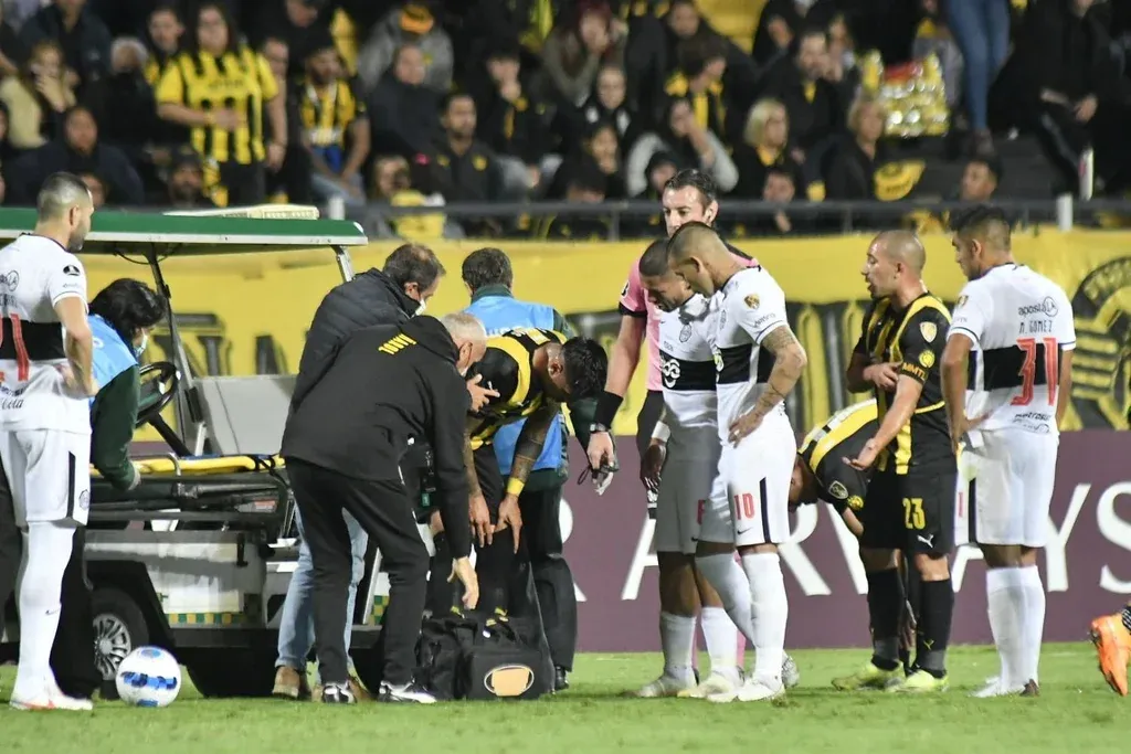 Ramón Arias, de Peñarol, recibió una fuerte falta en su rodilla izquierda y estuvo a punto de salir en el primer tiempo ante Olimpia