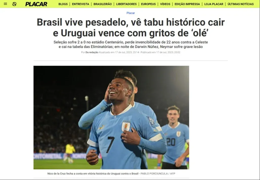 La revista deportiva Placar aseguró que Brasil "vive una pesadilla" y vio caer un "tabú histórico", en alusión a los 22 años consecutivos sin victorias de Uruguay contra la selección auriverde. Además, destacaron que Uruguay ganó "con gritos de 'olé'", que la hinchada uruguaya entonó cerca del final del encuentro.