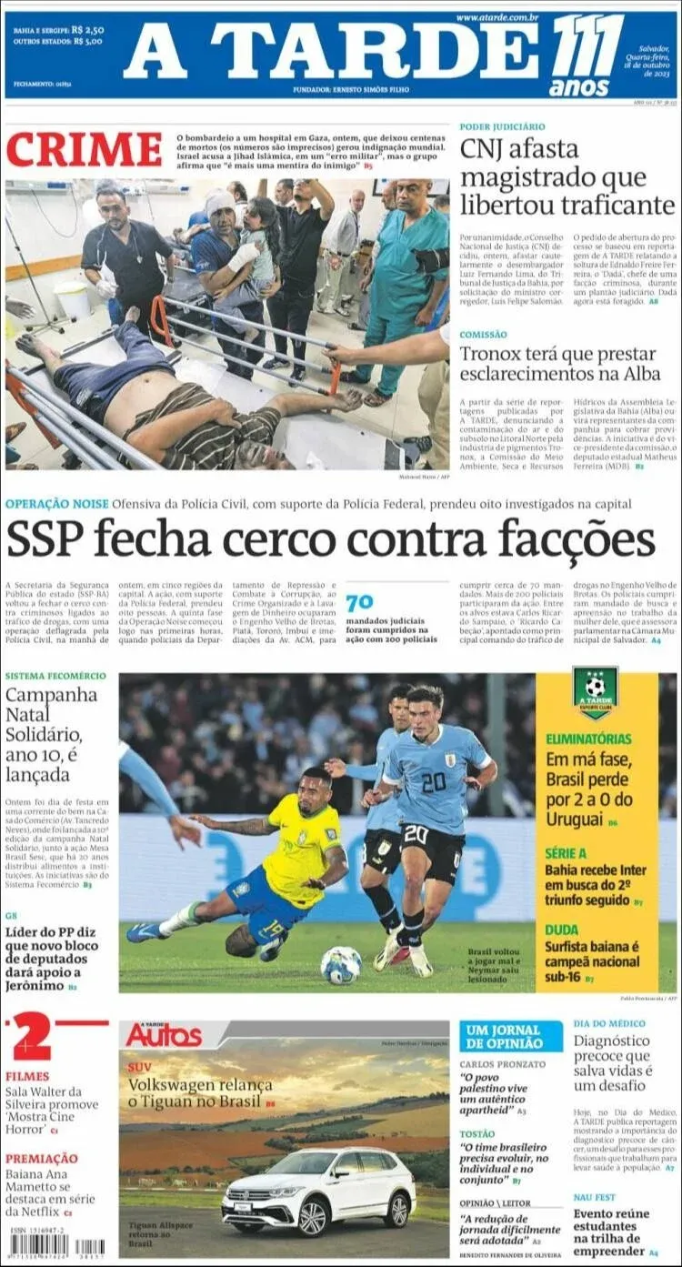 Para A Tarde, Brasil "volvió a jugar mal". El medio de Salvador también destacó la lesión de Neymar, al igual que Folha de Sao Paulo, que comunicó la "sospecha" de una "lesión grave" del mediapunta del Al-Hilal.