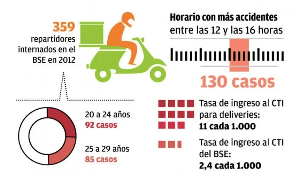 Un delivery por día, en promedio, ingresa al Banco de Seguros del Estado (BSE) por daños provocados por accidentes de tránsito. Muchos no reciben el alta hasta después de seis meses; la mitad tiene menos de 30 años. “En esa corrida por mejorar el salario se están exponiendo a lesiones graves”, dijo la médica laboral Sylvia Perazza del Servicio de Salud Ocupacional.