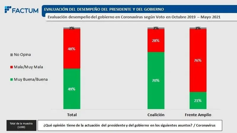 De acuerdo a Opción, los que desaprueban la gestión sanitaria aún no son mayoría absoluta entre los frenteamplistas, donde se dividen en tercios las opiniones negativas, positivas y neutrales. Según Factum, solo uno de cada cinco frenteamplistas aprueba la gestión sanitaria.