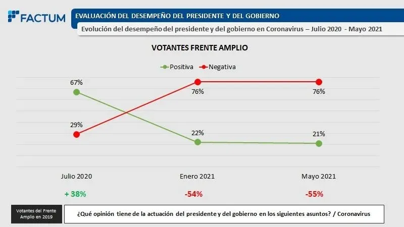 A diferencia de Opción, Factum sugiere que el deterioro en la percepción de la gestión sanitaria se acentuó sobre todo entre fines del año pasado y principios de 2021, pero además no distingue las opiniones neutrales y plantea que hoy en día existen dos bloques antagónicos de igual magnitud.
