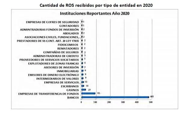 Los reportes de operaciones sospechosas (ROS) de lavado de activos totalizaron 694 en 2020, y tuvieron un descenso de 13% respecto a lo registrado en 2019. El año pasado siguieron predominando los reportes del sector financiero, y cayeron fuertemente los del sector no financiero, según la memoria anual de la Unidad de Información y Análisis Financiero (UIAF) del Banco Central