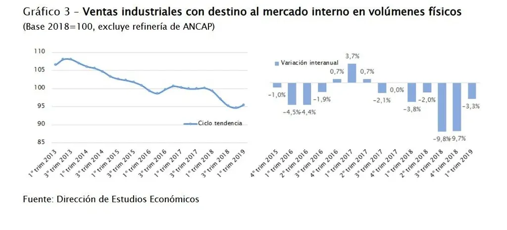 En tanto, las ventas industriales en volúmenes físicos con destino al mercado interno presentaron una caída del 3,3% en el primer trimestre de 2019 en la comparación interanual.