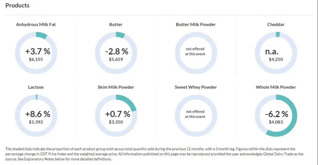 En la lectura por subrubros, en el caso de la leche en polvo entera (WMP), que es el producto lácteo de mayor volumen en las colocaciones externas de Uruguay, el precio promedio también descendió, en ese caso 6,2%, registrando un promedio igualmente interesante por lo alto, US$ 4.083 por tonelada (tras los US$ 4.364 de la subasta anterior).