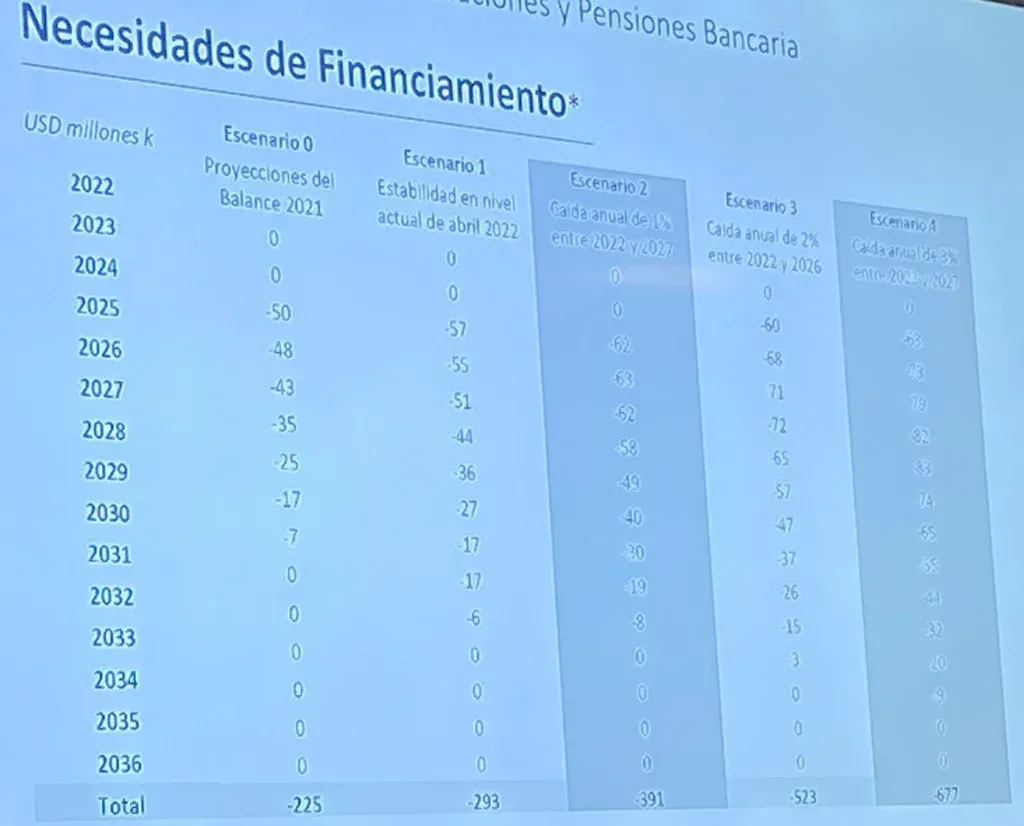 En las gráficas presentadas al Parlamento, el abogado planteó cinco escenarios con necesidades de financiamiento, que van desde US$ 225 millones hasta US$ 677 millones en 14 años (desde 2022 hasta 2036).