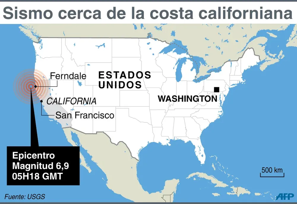 Un terremoto de 6,9 grados en la escala abierta de Richter sacudió este lunes la costa norte de California, a unos 80 kilómetros de tierra firme, según el Servicio Geológico estadounidense (USGS), sin que se haya informado de heridos ni daños hasta el momento.