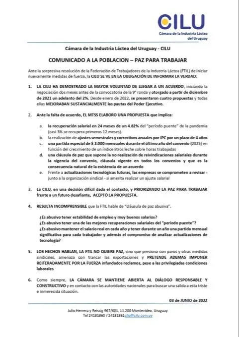 La Cámara de la Industria Láctea del Uruguay (CILU) emitió este viernes un comunicado en el que afirma que resulta incomprensible que la Federación de Trabajadores de la Industrial Láctea (FTIL) hable de “cláusula de paz abusiva”, saliendo al cruce de lo que comunicó y decidió este jueves la FTIL.